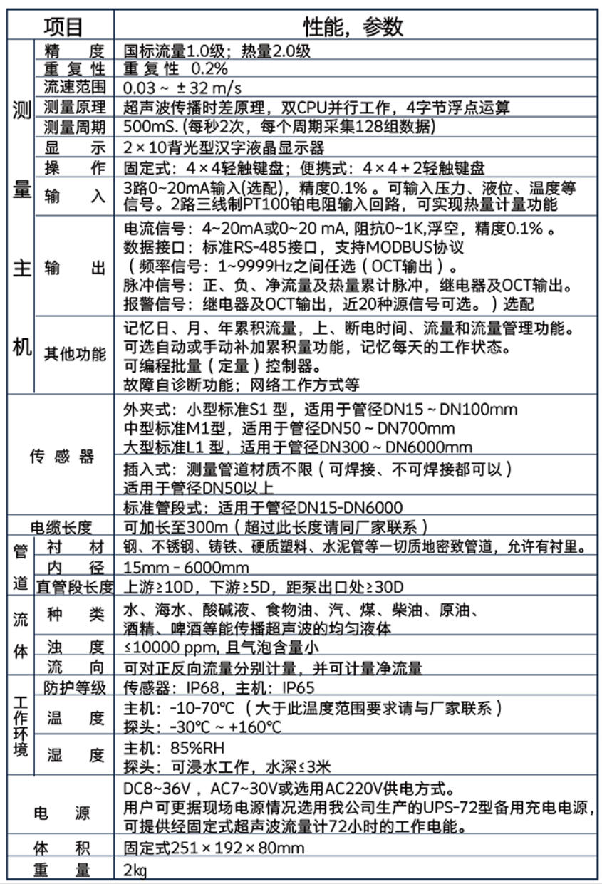 管段式超声波流量计,高清液晶显示,中英意三种语言,可显示瞬时流量、净累积量、暖时流速、正累积量、负累积量、只期时间、热流量/总量、温度输入三线制PT100、今日累积流量,储存或读取管道参数等功能。 采用三防涂漆进口主板元件,功耗低、精准稳定、无压损。防护等级可达IP68;流量范围可达1500:1;测量介质温度可达160℃。