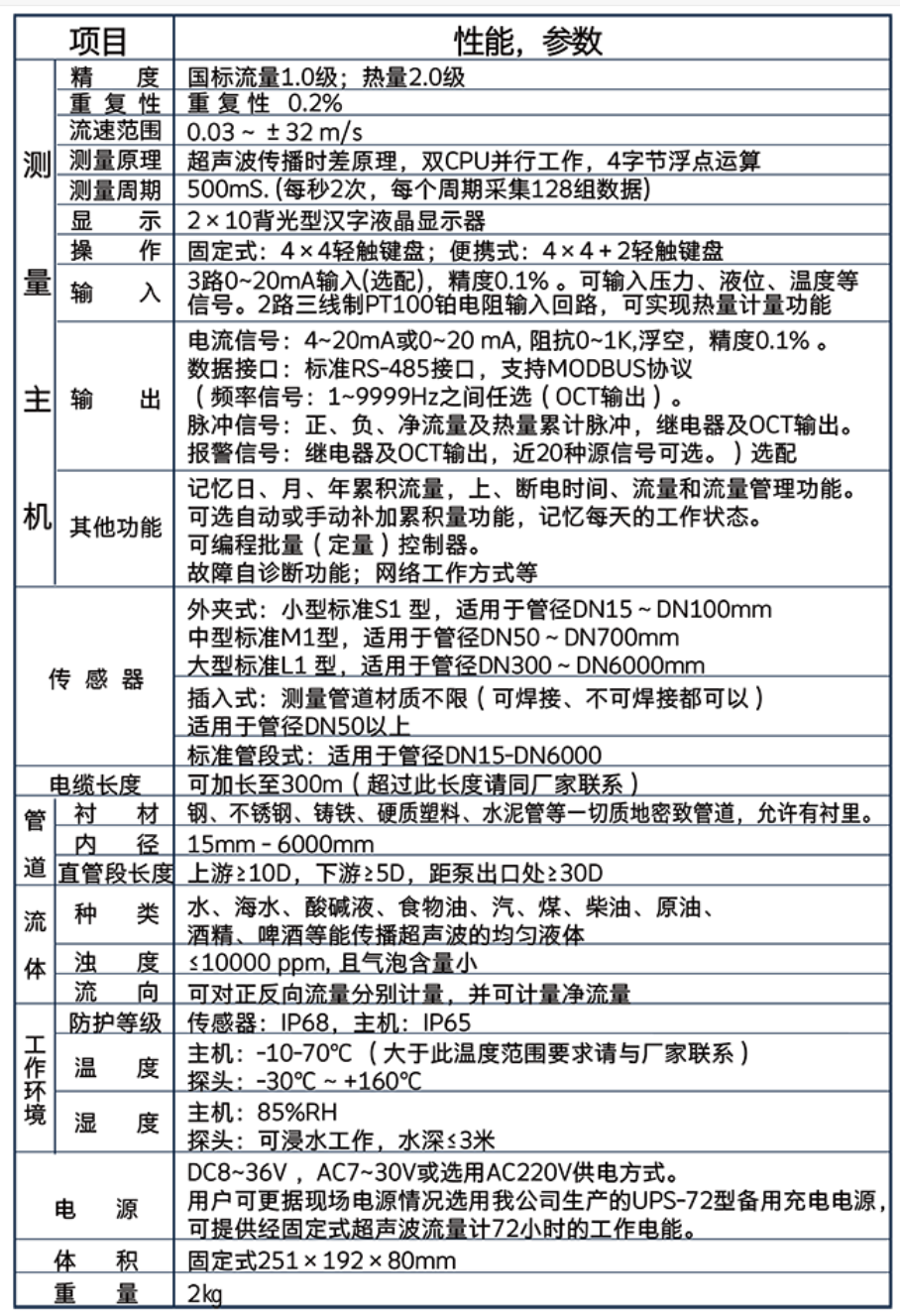 固定式超声波流量计/热量表主机,分为壁挂标准型、隔爆防爆型、电池供电型。 高清液晶显示,中英意三种语言,可显示瞬时流量、净累积量、瞬时流速、正累积量、负累积量、日期时间、热流量/总热量、温度输入三线制PT100、今日累积流量,储存或读取管道参数等功能。分体固定式便于安装,适用于多种现场,产品设计寿命10年,记录数据存储时间长达10年,支持断电记忆。插入式传感器为304不锈钢材质,是指在被测管道上利用专用开孔工具在不停产的情况下在线打孔,使传感器和被测介质直接接触,从而实现流量测量的种安装方式,该款传感器解决了外夹式传感器在测量结垢较厚的管道时不易接收到信号及长时间测量信号衰减的问题,具有不停产安装、免维护、与管径无关、无压力损失等特点。